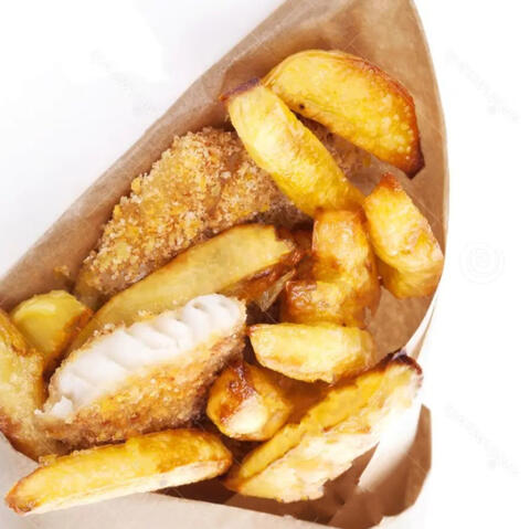 Breaded cod and potato wedges, fried and wrapped in paper.