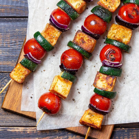 Fried pieces of giant-spider meat, impaled on a skewer with red onion, baby marrow and cherry tomatoes, seasoned with salt and smoked paprika.