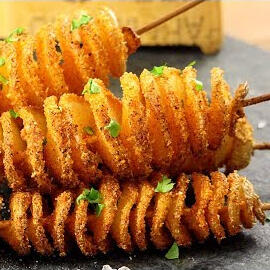 A potato sliced in a spiral, fanned out on a skewer, deep fried and sprinkled with both rosemary and salt