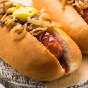 A hotdog with a wholegrain bun, pork sausage, Gilnean mustard and pan-fried onion