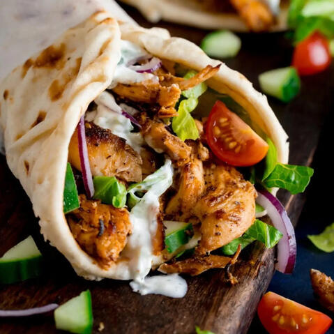 Carvings of roasted goose, wrapped in a flatbread with red onions, cherry tomatoes, salad, cucumbers and garlic yogurt sauce.