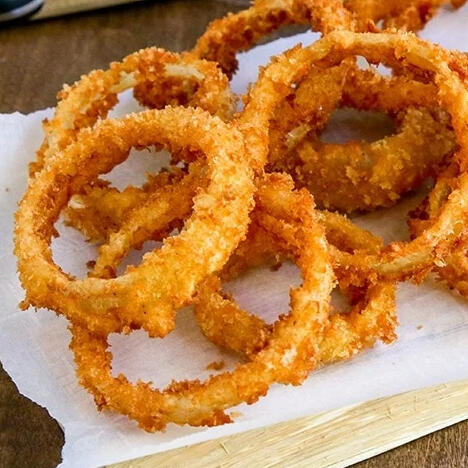 Thin, ring-shaped slices of onion coated in batter and sprinkled with salt and hot paprika