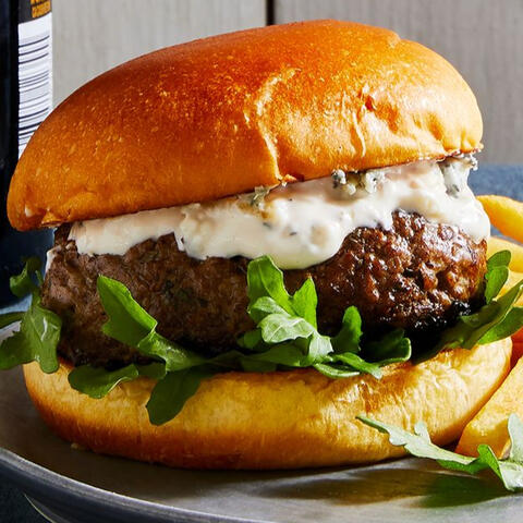Devilsaur meat patty with a garlic-bread bun, blue cheese, lettuce, pickles, whiskey BBQ sauce