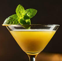 "The Golden Girl" - A mix of smooth apple whiskey, sweet peach schnapps, and a rich Gilnean City Dry Gin, all topped off with cool, refreshing apple juice, served with ice and a mint leaf.